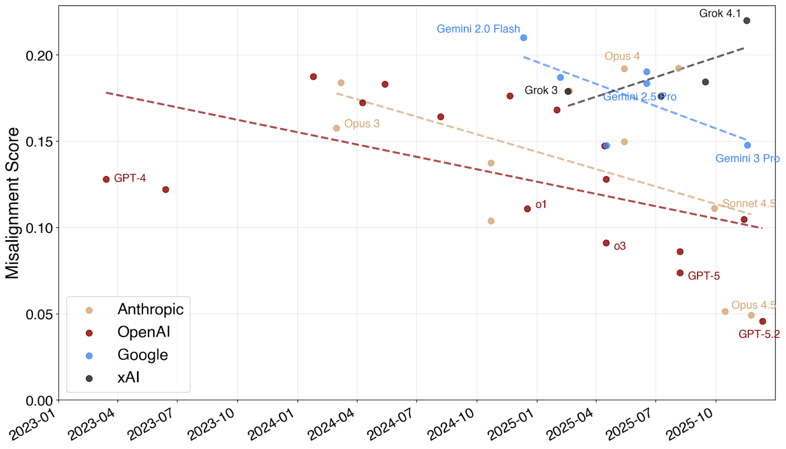 Strikingly, we made a lot of progress over the span of 6 months in 2025: Sonnet 4.5 (Sep 29) is a lot more aligned than Sonnet 4 and Opus 4 (May 22), and Opus 4.5 (Nov 24) is even more aligned than Sonnet 4.5. Around the same time, OpenAI’s and Google’s models have also become more aligned, with GPT-5.2’s alignment being on par with Opus 4.5.